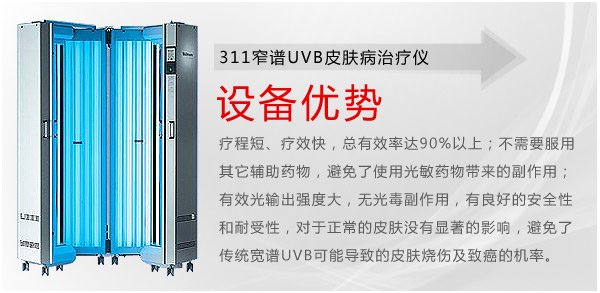 疗程短、疗效快,总有效率达90%以上;不需要服用其它辅助药物,避免使用光敏药物带来的副作用;有效光输出强度大,无光毒副作用,有良好的安全性和耐受性,对于正常的皮肤没有显著影响,避免了传统宽谱UVB可能导致的皮肤烧伤及致癌的机率。